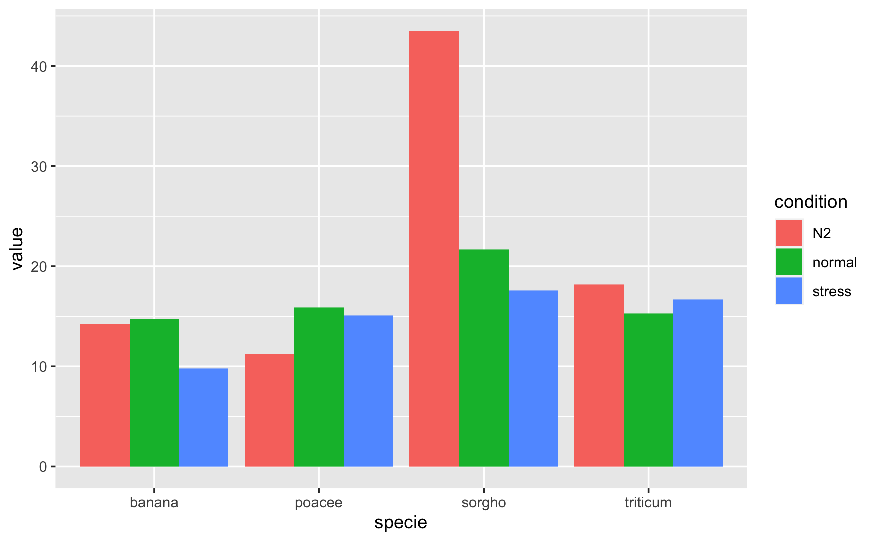 geom_bar(aes(x = specie, y = value, fill = condition),