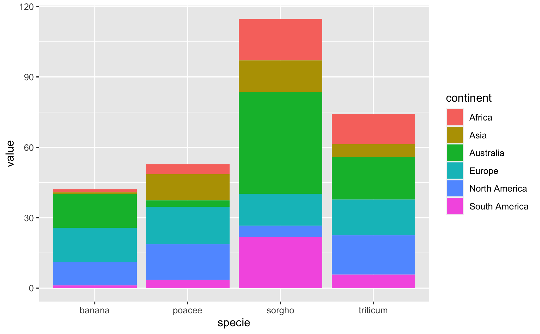 geom_bar(aes(x = specie, y = value, fill = continent),