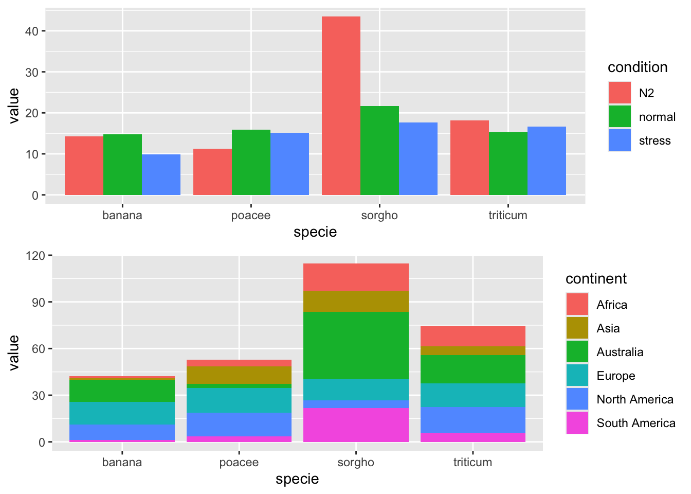 geom_bar(aes(x = specie, y = value, fill = continent),