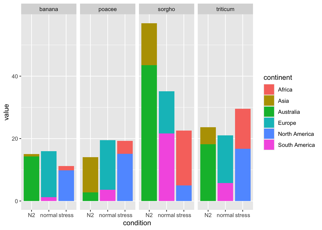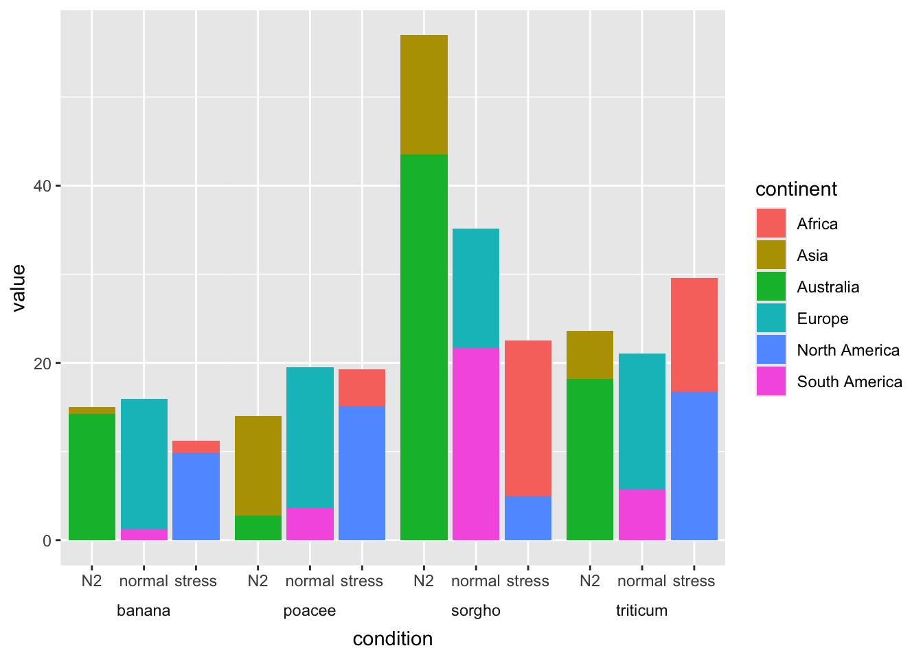 geom_bar(aes(x = condition, y = value, fill = continent),